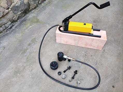 Foot pump operated hydraulic hole punch tool kit, operated by foot pedal pump, fast speed hydraulic system with 900cc oil tank, 1.8 meter length of hydraulic tube, 15-ton hydraulic punching force.